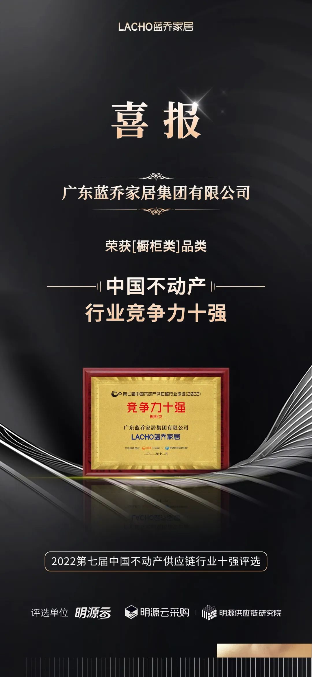现场,揭晓了《2022年度中国不动产供应链行业竞争力十强》榜单,蓝乔家凭借出色的产品力,技术力荣登“2022年度中国不动产【橱柜类】品类行业竞争力十强”榜单。